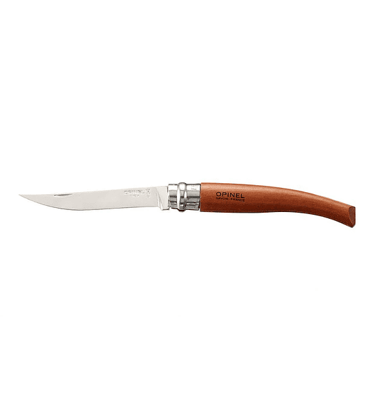 Ideal para un corte preciso, conseguir láminas finas, preparar el pescado. El Padouk le aporta exotismo a este cuchillo. La silueta de la navaja afilada es esbelta y elegante. El mango de madera de Padouk procedente de África tiene un color marrón rosado. La hoja con acabado poliglaseado le da un efecto de espejo soberbio. Para una máxima seguridad, Opinel ha creado un sistema Virobloc para evitar que la hoja se abra y se cierre sola. Es perfecto para trabajar con el pescado.